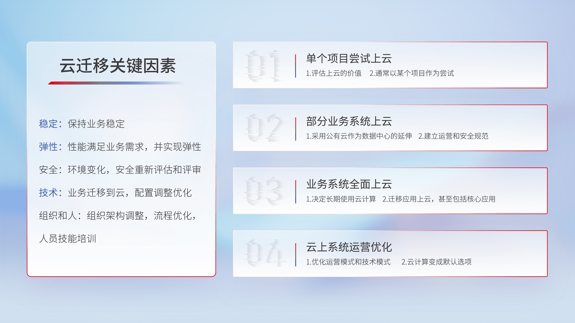 结合实际业务,,,,从规划设计、、云平台选型、、、云原生改造、、、数据迁移、、、、集成交付,,迁移全过程为客户识别最佳上云路径,,,做好风险识别管理,,,设计网络架构、、、身份权限、、安全审计合规、、操作审计、、、日志审计、、监控告警策略、、多站点容灾设计等,,,对云上基础设施进行整体规划,,提升IT治理水平,,以满足弹性、、、、高可用、、、高性能的需求。。。